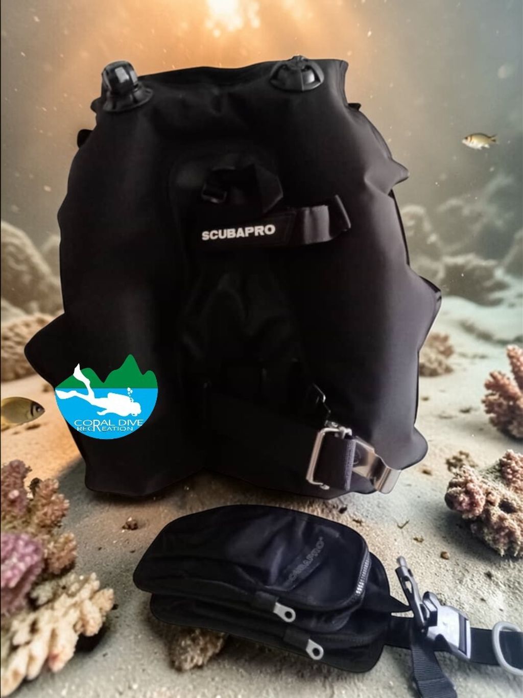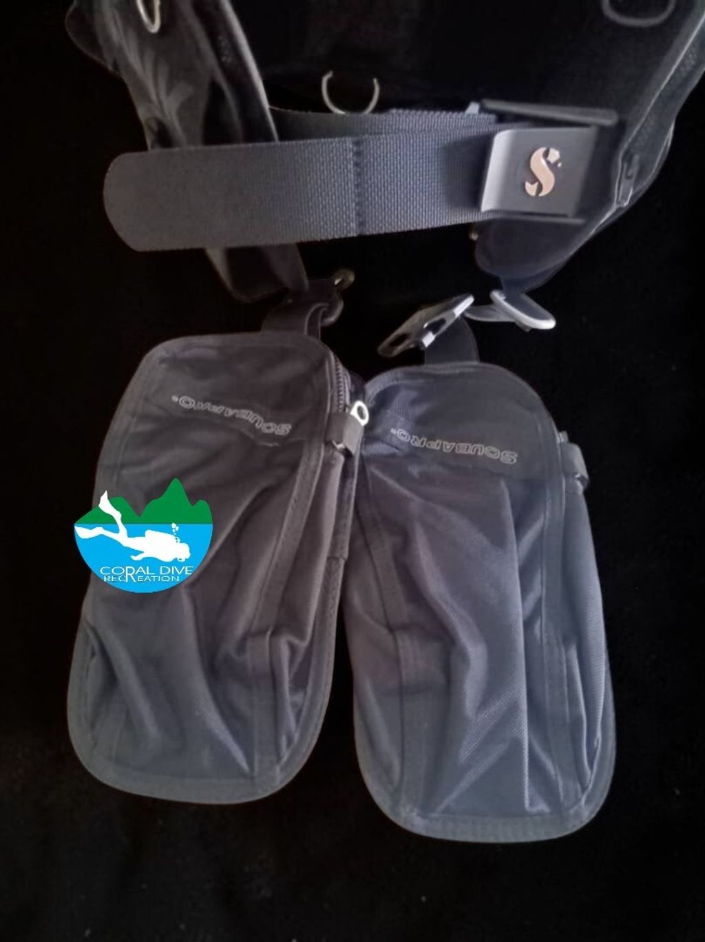 - Super Cinch stainless steel tank band system is positioned lower and teamed with a second Velcro™ strap to secure the tank for transport and diving.