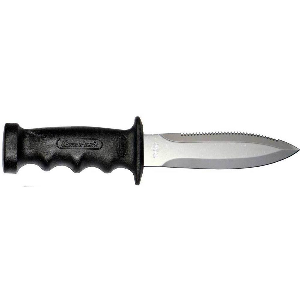 One side of the stainless steel blade is straight-edged, the other one is serrated right along the blade; they are both very sharp and effective for line cutting.