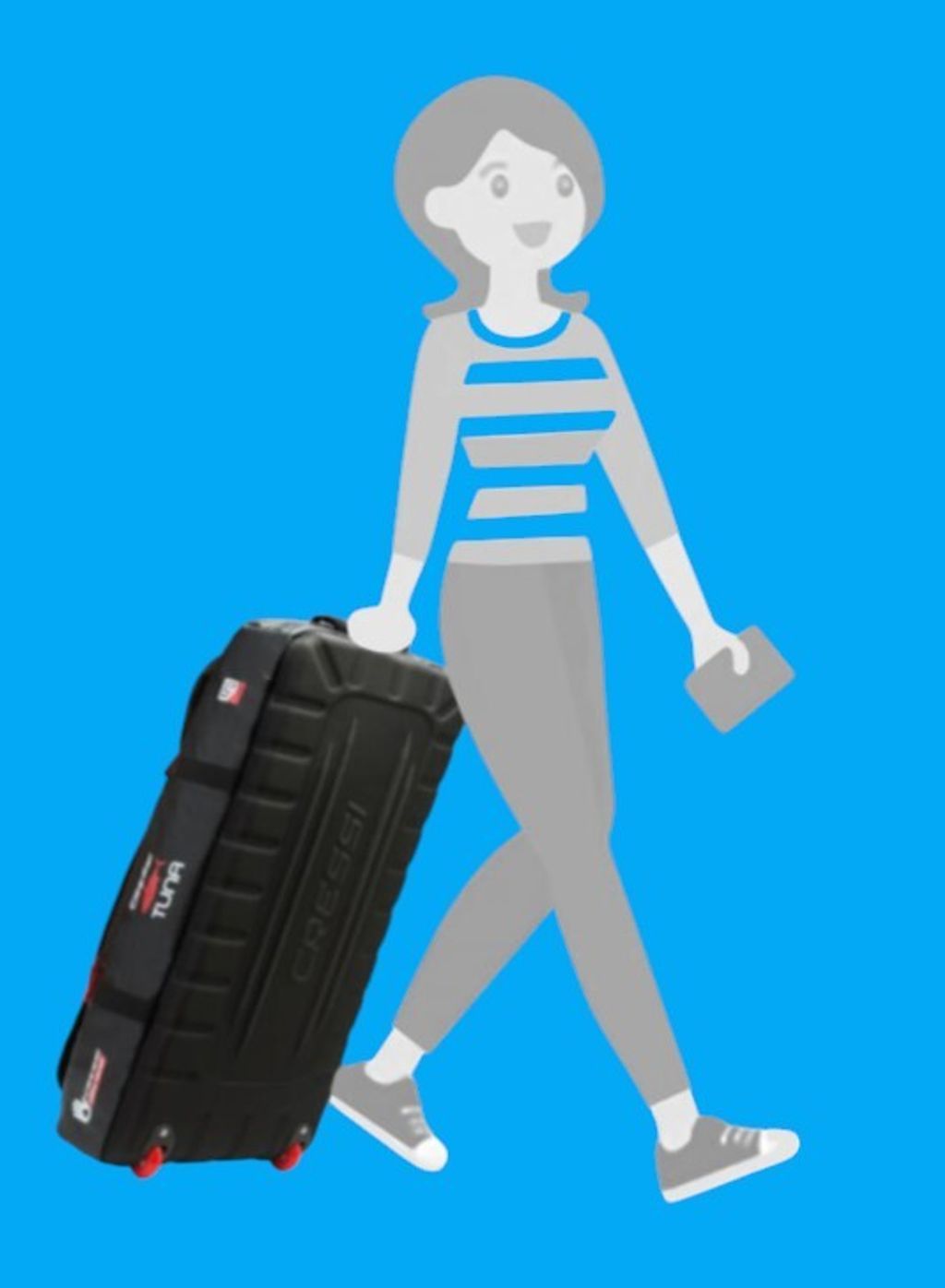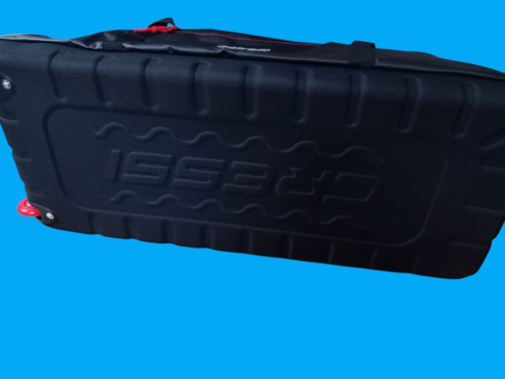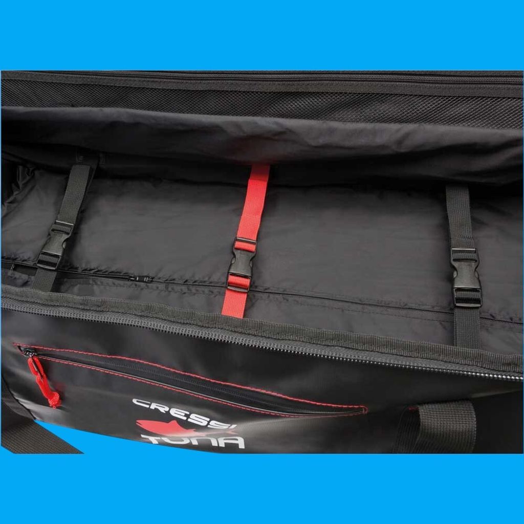 Silicone wheels for a quiet slide. It has two strong welded handles on each end, very useful for transporting, especially when the bag is heavily loaded, and a handle-strap system with carabiners and especially resistant accessories that allow very important loads (extreme resistance test up to 145 kg of weight). YKK © 8 pitch metal zippers with marine treatment with double cursor. Zipper flap. U- shaped configuration for a wide opening of the storage space and perfect access and comfort for placing the equipment.