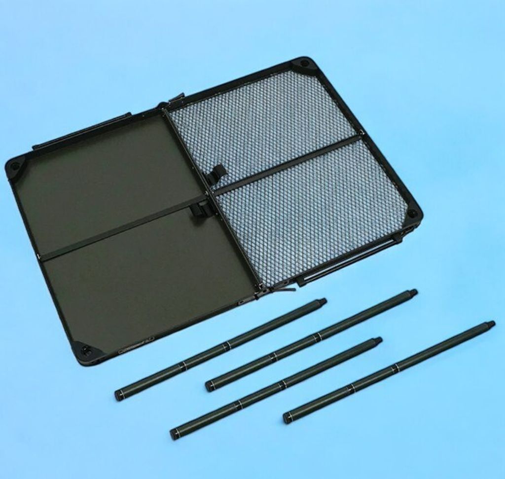 Wild Field 2-folding table with a stylish olive khaki color iron mesh Field series top with a rough feel. The aluminum material firmly supports the table and can be easily fixed with a lock on the folding part, making this table versatile and freely usable anywhere.