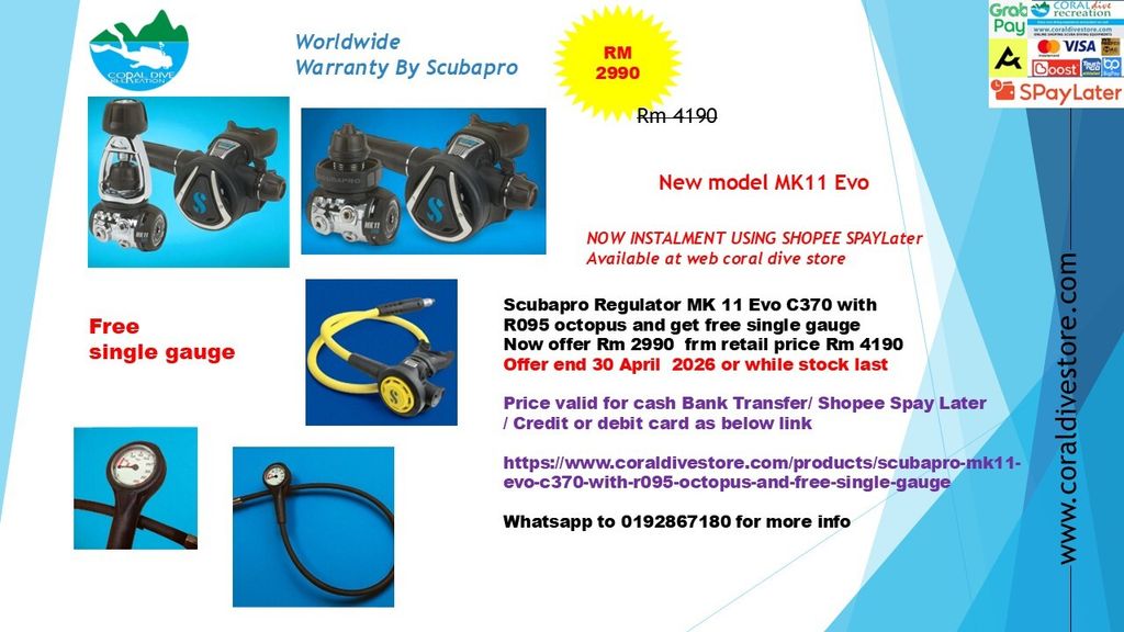 Scubapro MK11 Evo C370 with R105 octopus and free single gauge. offer end 31 April 2026