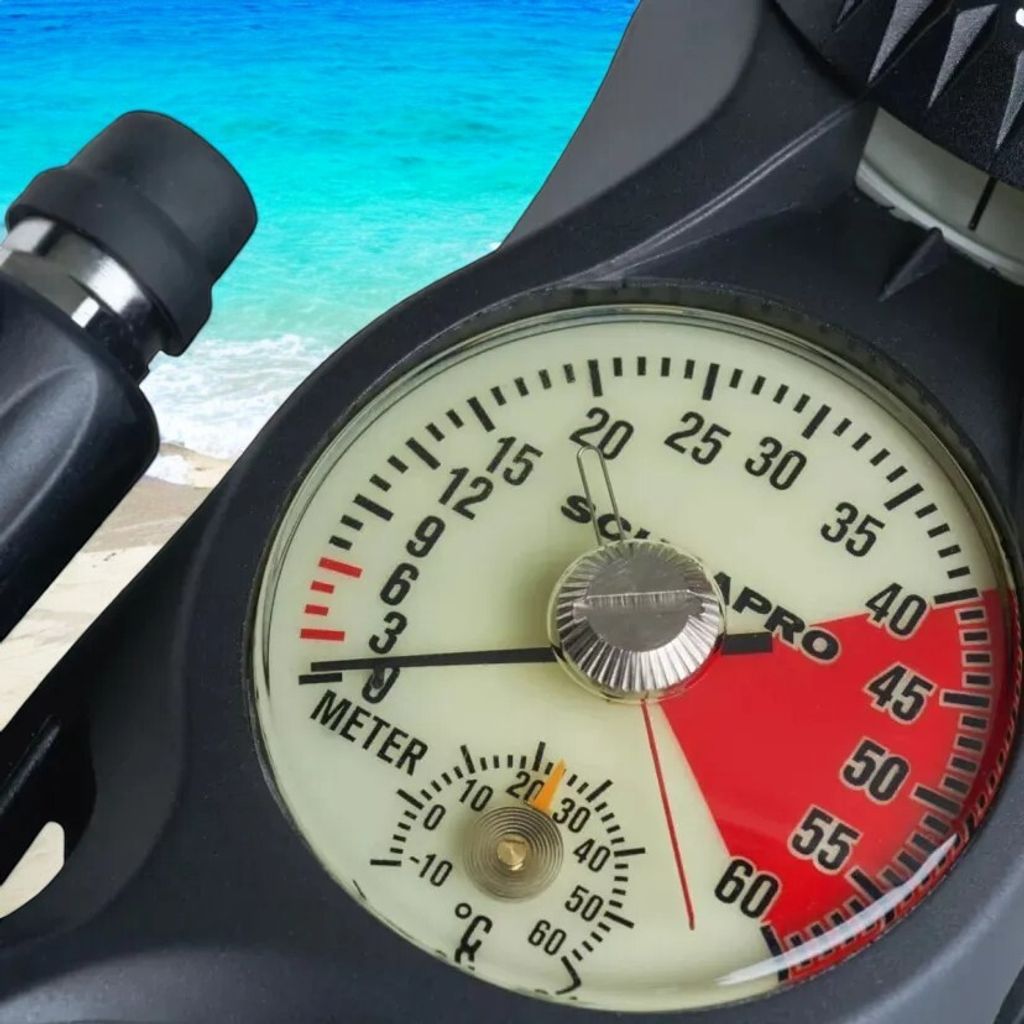 - Oil-filled analog depth gauge with linear Bourdon tube design.
