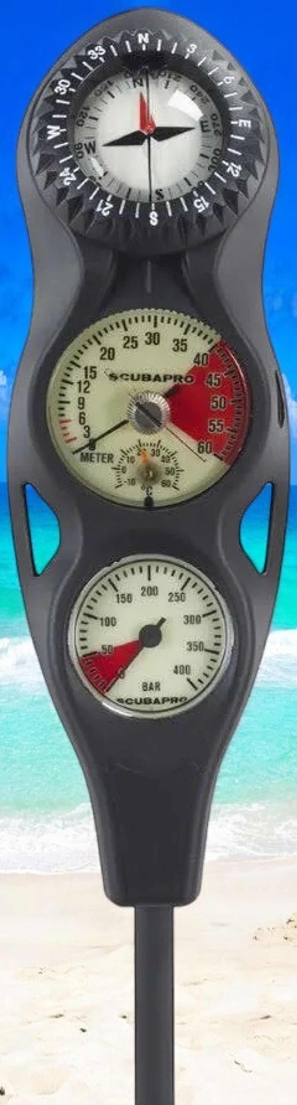 Three-gauge console with compact, plastic-case pressure gauge, easy-to-read depth gauge and FS-1.5 compass. Perfect for the diver who values convenience, accuracy, and style.