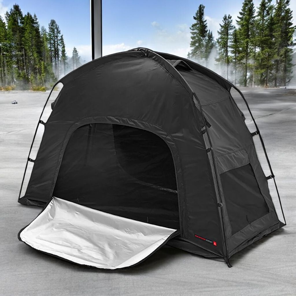 It is a coat tent that can be installed on top of a bed in a night shop and does not come in direct contact with the cold and uneven ground. It can be installed simply and easily with only two poles, and the high-strength aluminum 7001 poles (Ø8.5) provide strong support for the tent. The double canopy system that covers the front as well as the top creates your own private space, and the angle can be freely adjusted to provide wide and perfect shade.