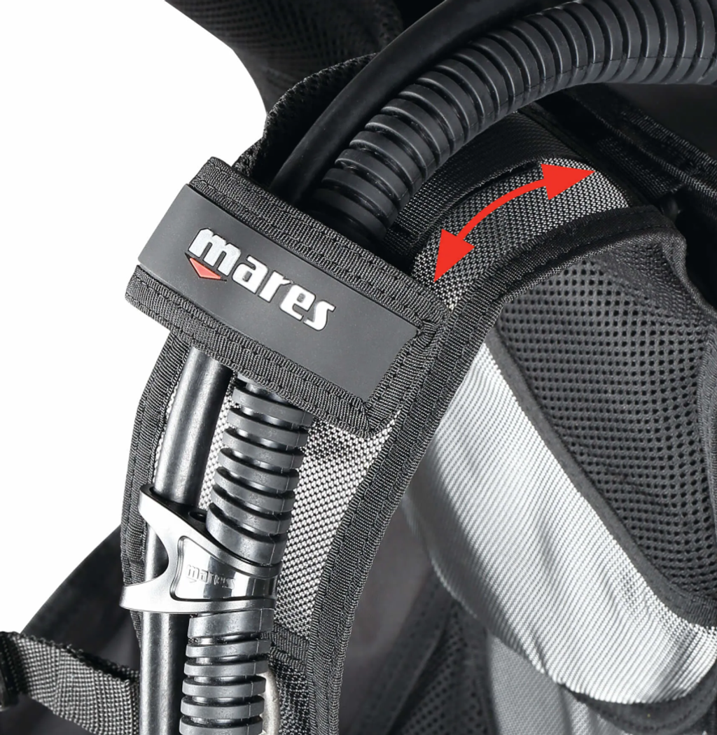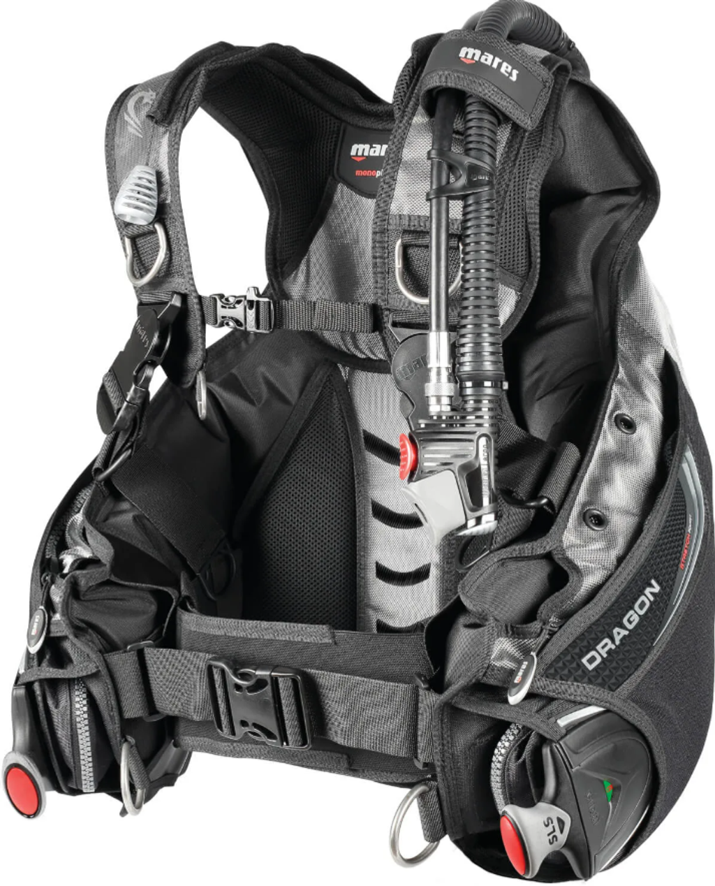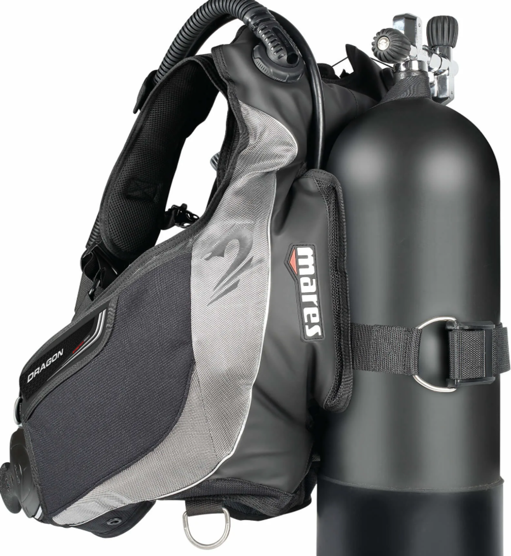 All the main characteristics of the Dragon have been developed for even greater comfort and stability combined with excellent fit and performance. Mares' new Jacket Style Dragon Bladder design is tightly tailored to reduce drag, placing much of the air cell around the tank. The air cell is contoured to greatly minimize the feeling of the bladder underneath your arms, and gives comfortable surface flotation. Air cell slides on shoulders for increased comfort when inflated. All that ergonomics and still has a lift of 42.5 lbs. (19.3 kg) size large.