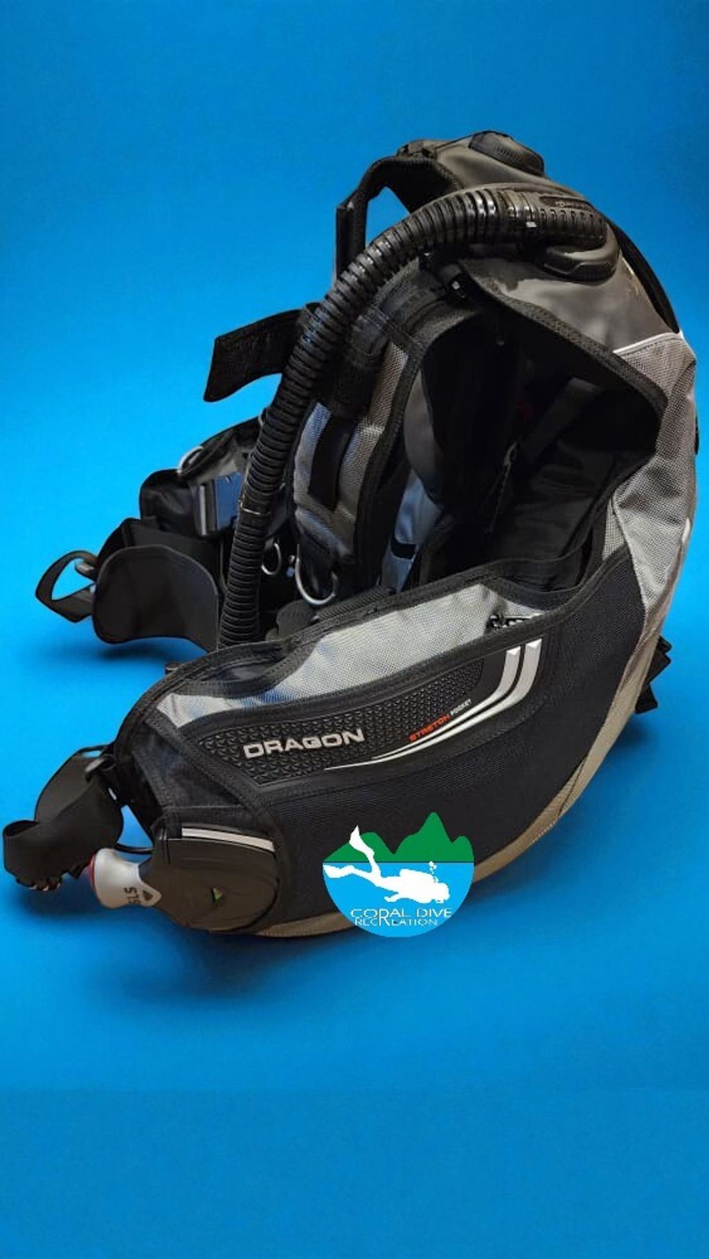 With torso adjustable 2" (50 mm) swivel shoulder straps, adjustable chest and waist straps, all equipped with squeeze-style" side release buckles for easy donning and doffing. Two angled high capacity cargo zippered pockets with stretch panels, position of the corrugated hose retaining epaulette can be adjusted, shaped shoulder straps adapt better to alleviate pressure on the shoulders, safety whistle and personalize label on weight pockets all makes this one great BCD. Dragon comes in multiple sizes and an owner's manual.
