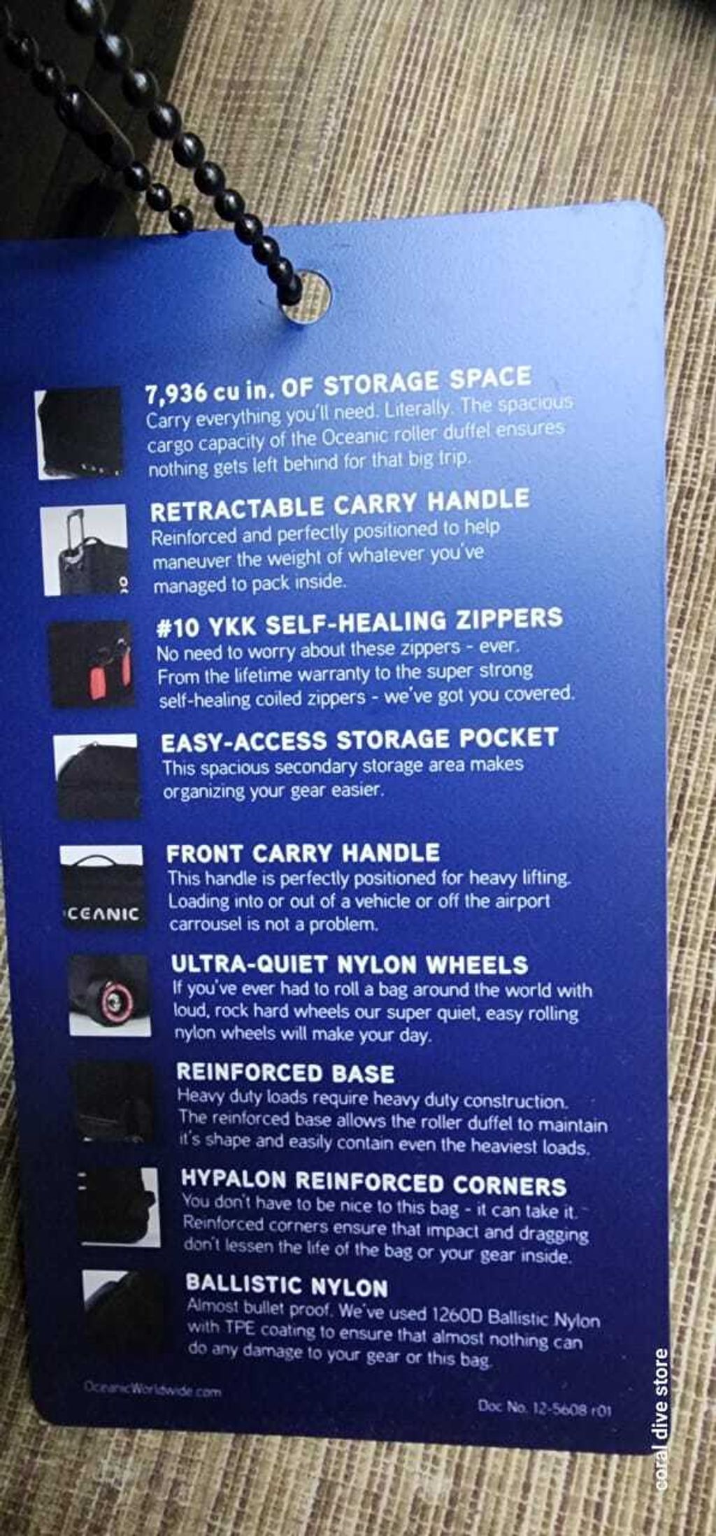 This high-end Oceanic bag is a traveling diver's must have. With a generous 7,936 cubic inches (130 liters) of storage space you can bring all your gear and even that kitchen sink you were forced to leave behind last time. Oceanic used the highest quality materials, zippers, wheels and construction and backed it with a lifetime warranty against any defects in materials or workmanship for life of the product. What more could you ask for? Ultra-Quiet Nylon Wheels: If you've ever had to roll a bag around the world with loud, rock hard wheels Oceanic's super quiet, easy rolling nylon wheels will make your day. Reinforced Base: Heavy duty loads require heavy duty construction. The reinforced base allows the roller duffel to maintain its shape and easily contain even the heaviest loads.