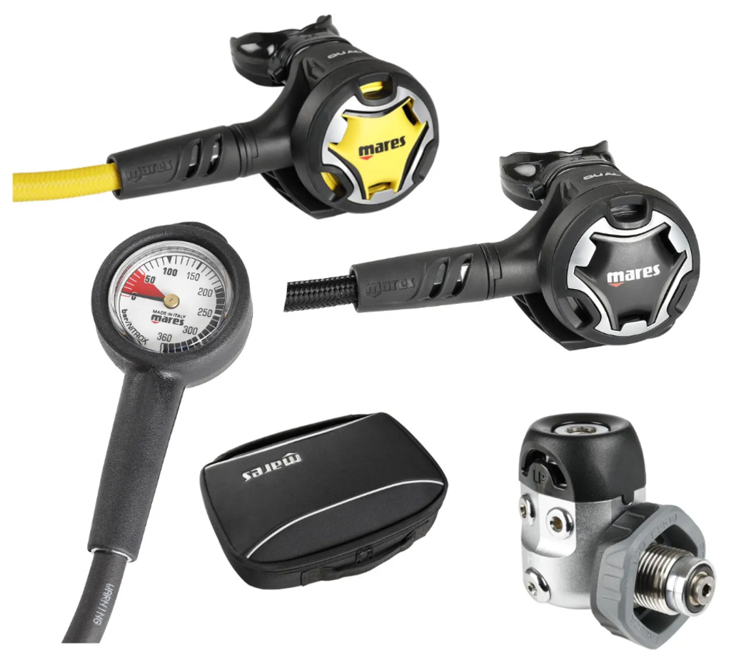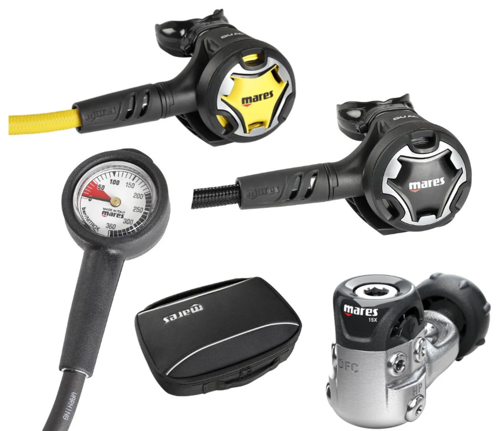 The 15X balanced diaphragm first stage features pre-oriented low and high-pressure ports. The set is supplied already assembled and ready to dive, into a dedicated bag for easy transportation and protection before and after use.