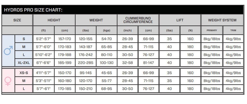 Available in four men's sizes (S, M, L, XL) and three women's sizes (XS/S, M, L), with 35 lbs/15.9 kg or 40 lbs/18.1 kg of buoyant lift, depending on size.