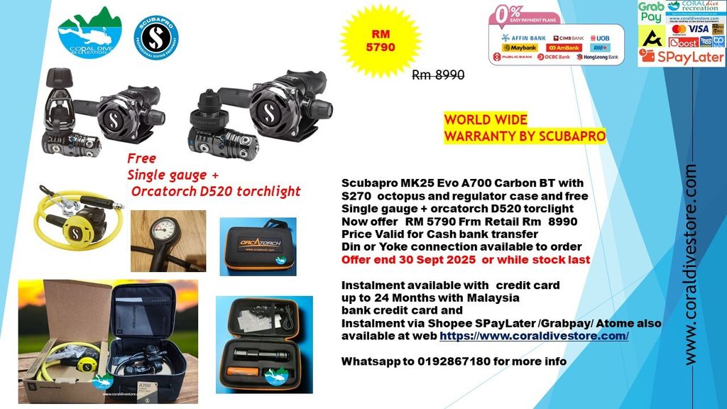 Scubapro MK25 Evo A700 Carbon BT with free S270 octopus. Offer end 30 Sept 2025 and free D520 torchlight