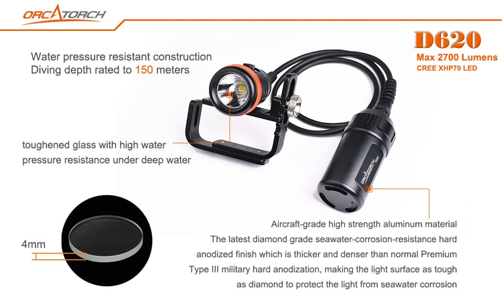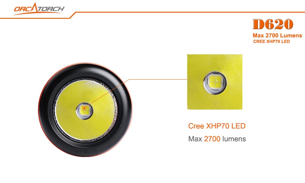 ORCATORCH D620 is a primary canister dive light specially designed for underwater adventure such as scuba diving and cave diving.