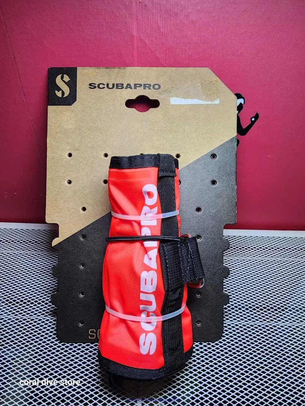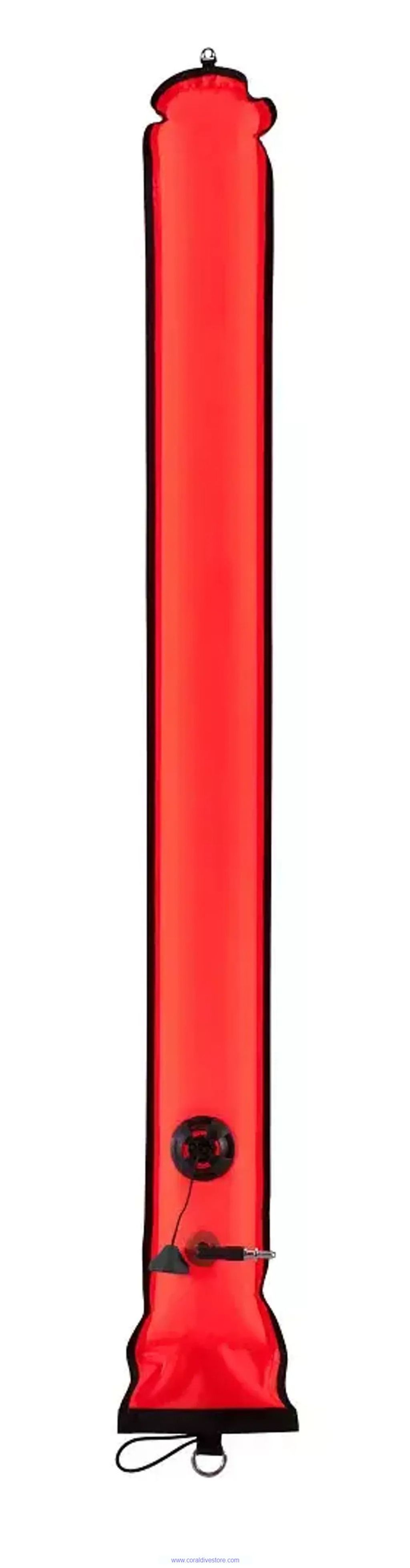 This professional grade SMB (surface marker buoy) features a double inflation system with an open bottom and duck beak valve as well as a metal inflator. The buoy is constructed of durable 210D nylon with HF welded seams. There’s a stainless D-ring and bungee loop on the lower end, with a plastic D-ring on top for a flashlight.